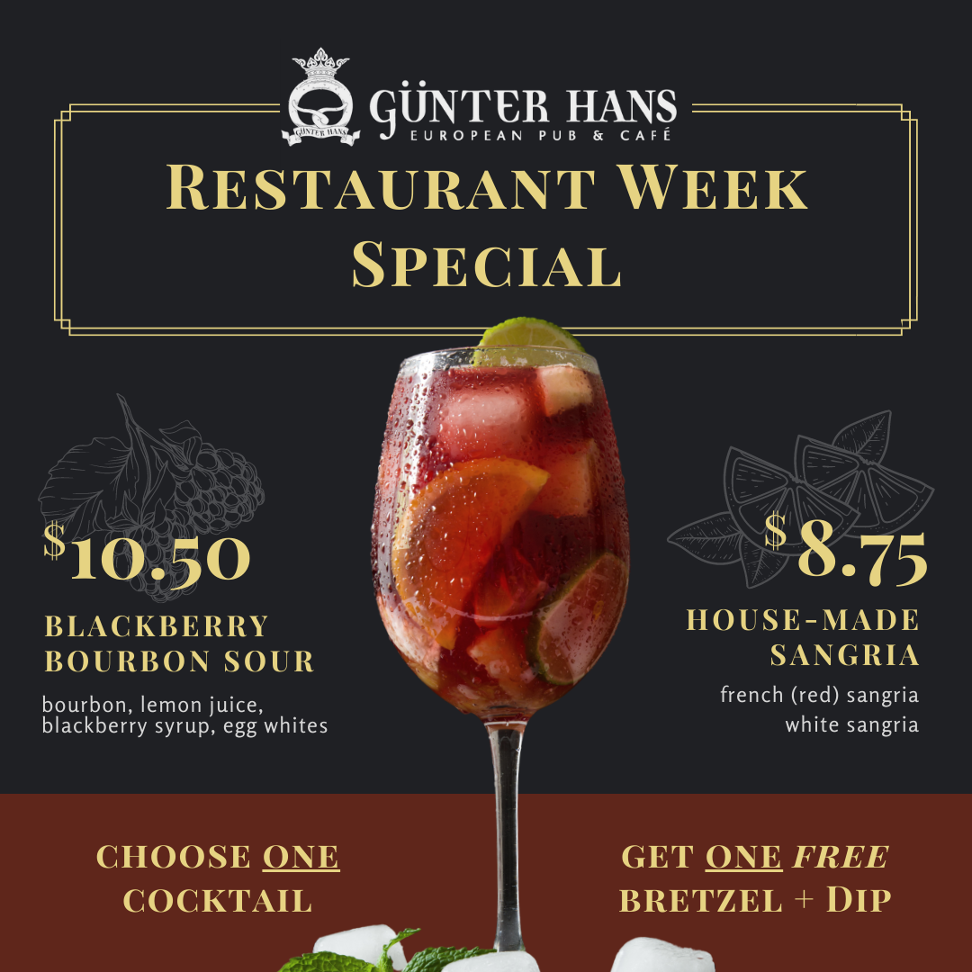 Günter Hans Special: Buy one cocktail (Blackberry Bourbon Sour, French Sangria, or White Sangria) and get one FREE bretzel & dip.